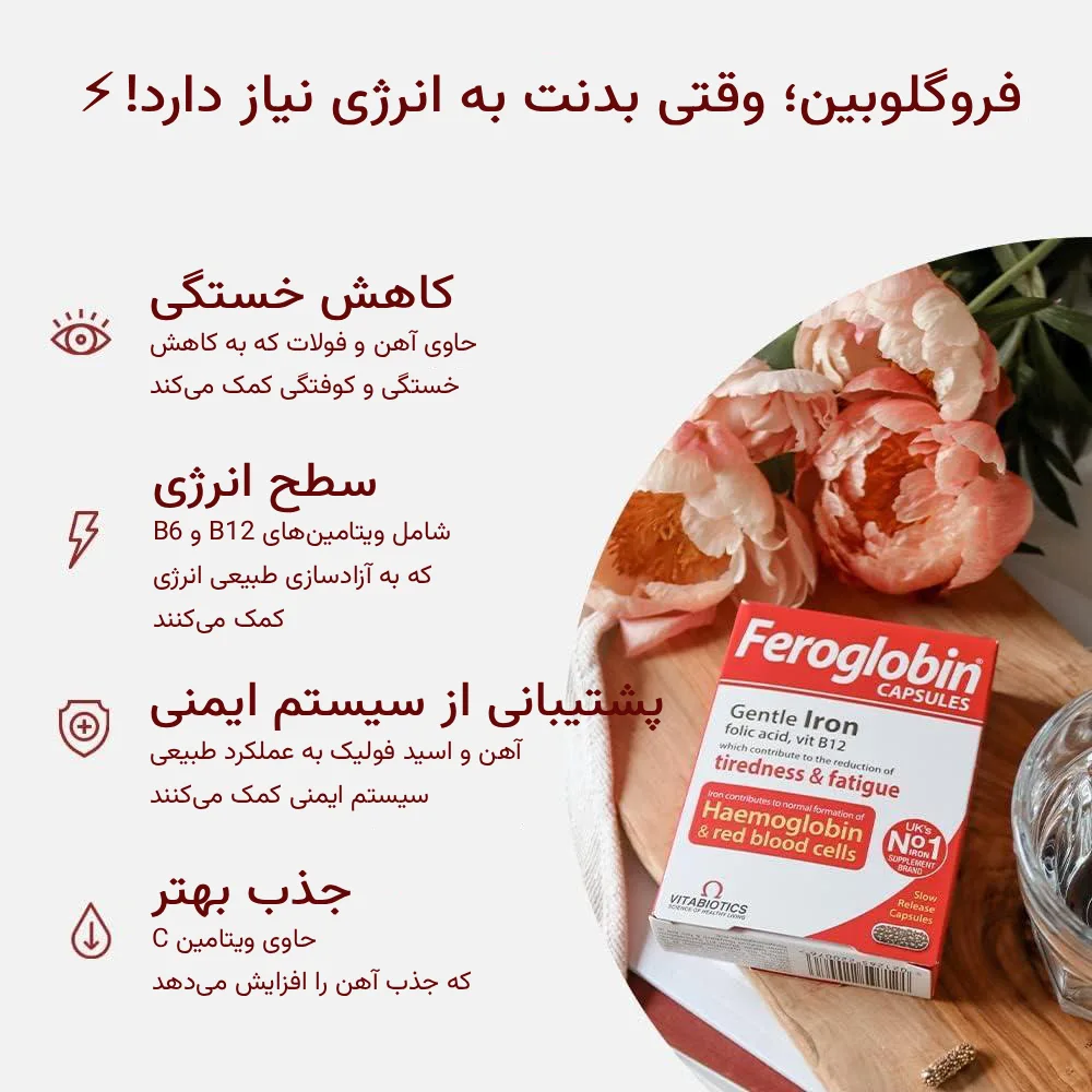 قرص فروگلوبین خارجی اصل محصول شرکت ویتابیوتیکس یک مکمل انگلیسیاست که با ترکیبی از آهن، ویتامین B12، فولیک اسید و ویتامین‌های گروه B به رفع کم‌خونی و افزایش انرژی بدن کمک می‌کند. این محصول با فرمولاسیون ویژه خود، جذب آهن را آسان‌تر کرده و عوارض گوارشی کمتری نسبت به مکمل‌های مشابه دارد. مصرف قرص فروگلوبین اصل باعث کاهش خستگی، تقویت سیستم ایمنی و بهبود تمرکز می‌شود. این کپسول انتخابی مناسب برای آقایان و بانوان در سنین مختلف به‌ویژه دوران بارداری و شیردهی است. بسته‌بندی 30 عددی آن برای مصرف یک ماه طراحی شده و کیفیت اصالت انگلیسی را تضمین می‌کند.